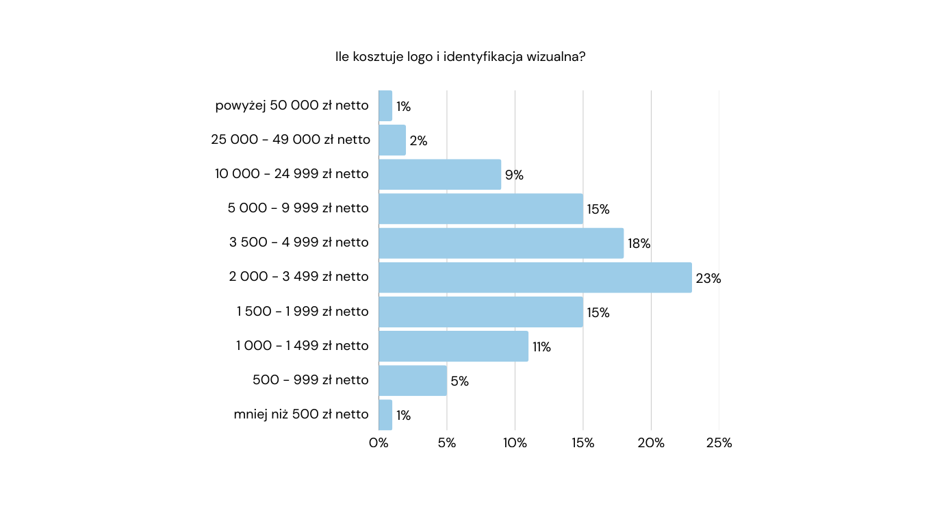 W przypadku projektu logo razem z prostą księgą identyfikacji wizualnej, w 2024 roku najczęściej podawaną ceną była kwota w przedziale 2000–3499 zł netto – według 23% ankietowanych.