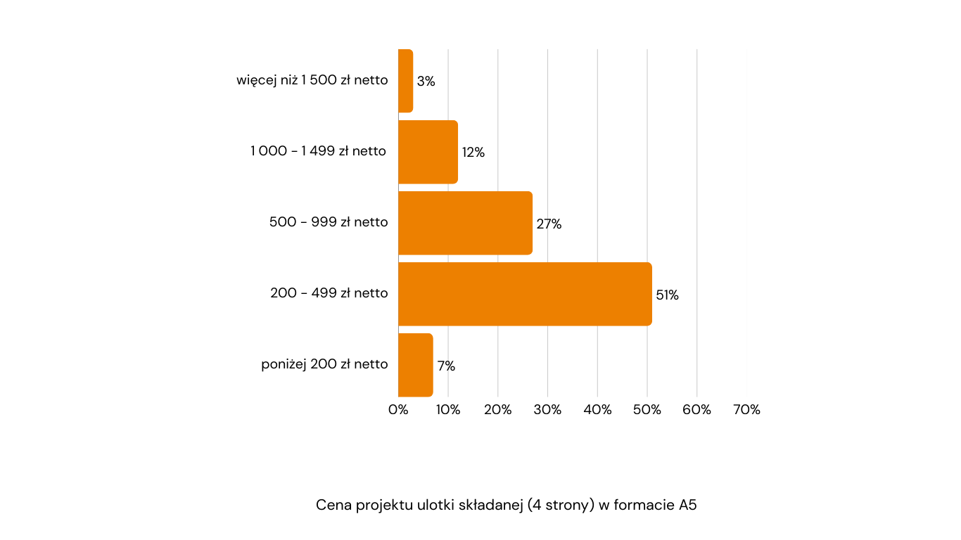 Dla ulotki składanej w formacie A5 (cztery strony), najpopularniejszym przedziałem cenowym okazało się 200–499 zł netto – wskazało tak aż 51% ankietowanych.