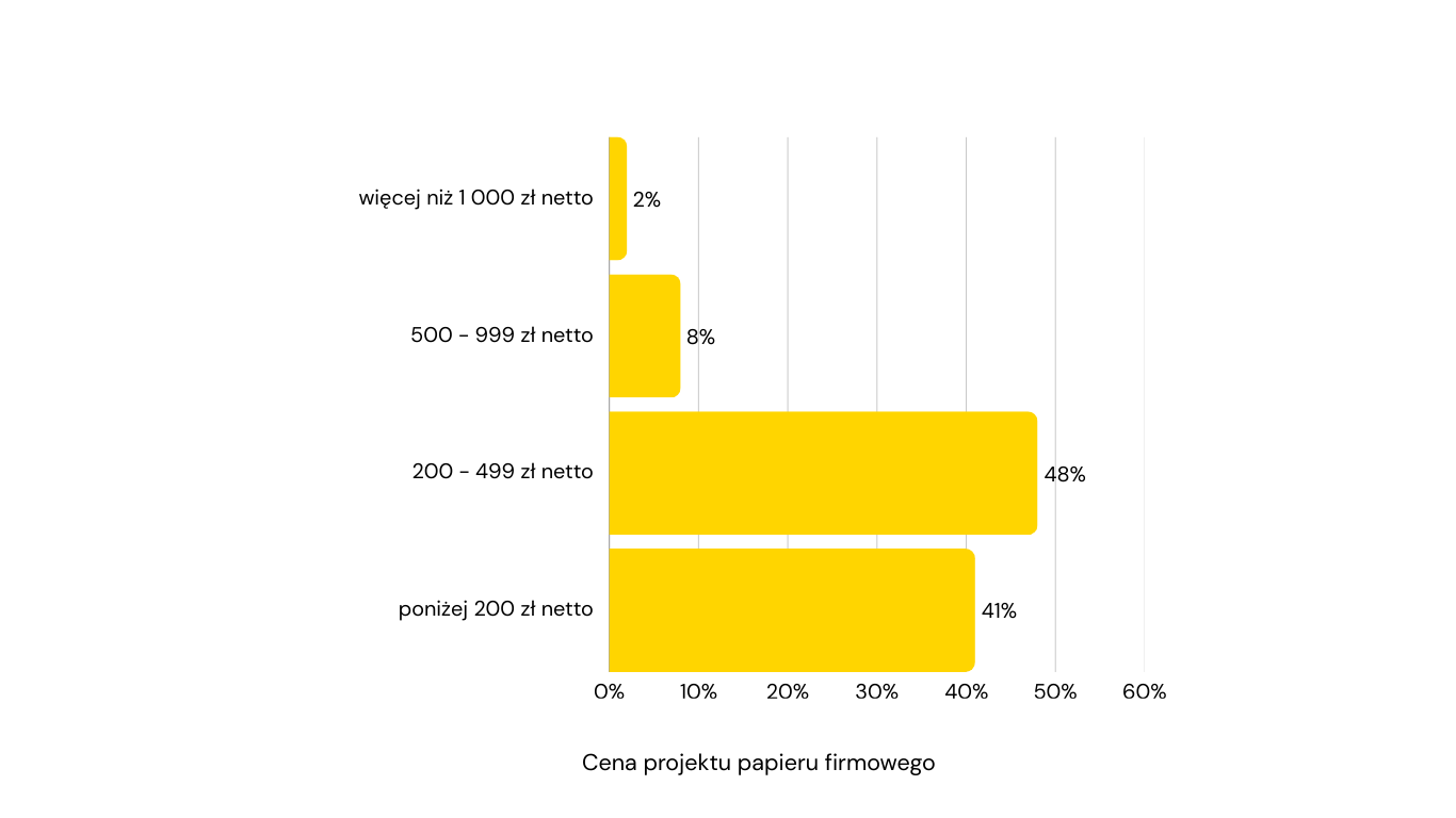 Najczęściej spotykanym przedziałem cenowym za zaprojektowanie papieru firmowego jest 200–499 zł netto – tak odpowiedziało aż 48% ankietowanych.