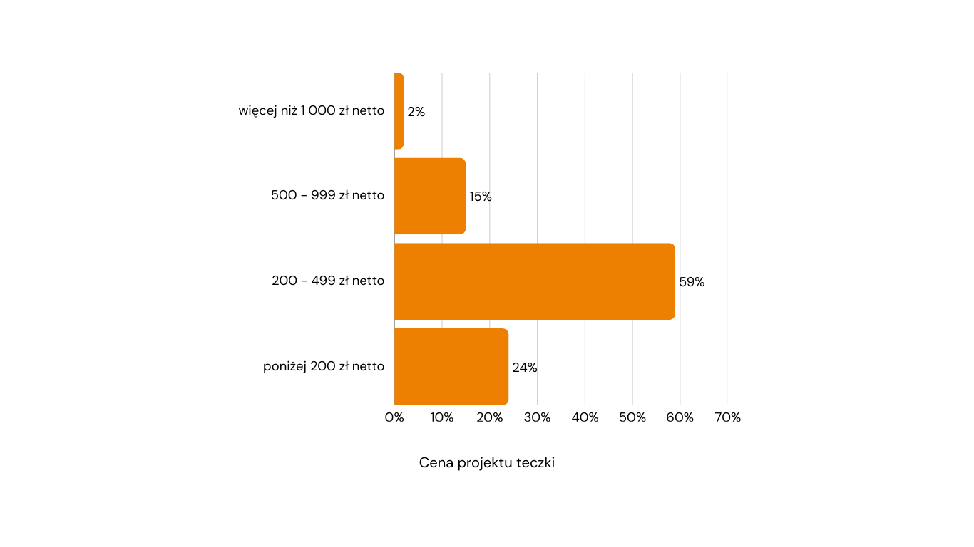 Ceny projektów teczek wyglądają podobnie. Aż 59% projektantów wycenia tę usługę na 200–499 zł netto, co wskazuje na to, że jest to najczęściej spotykany standard.