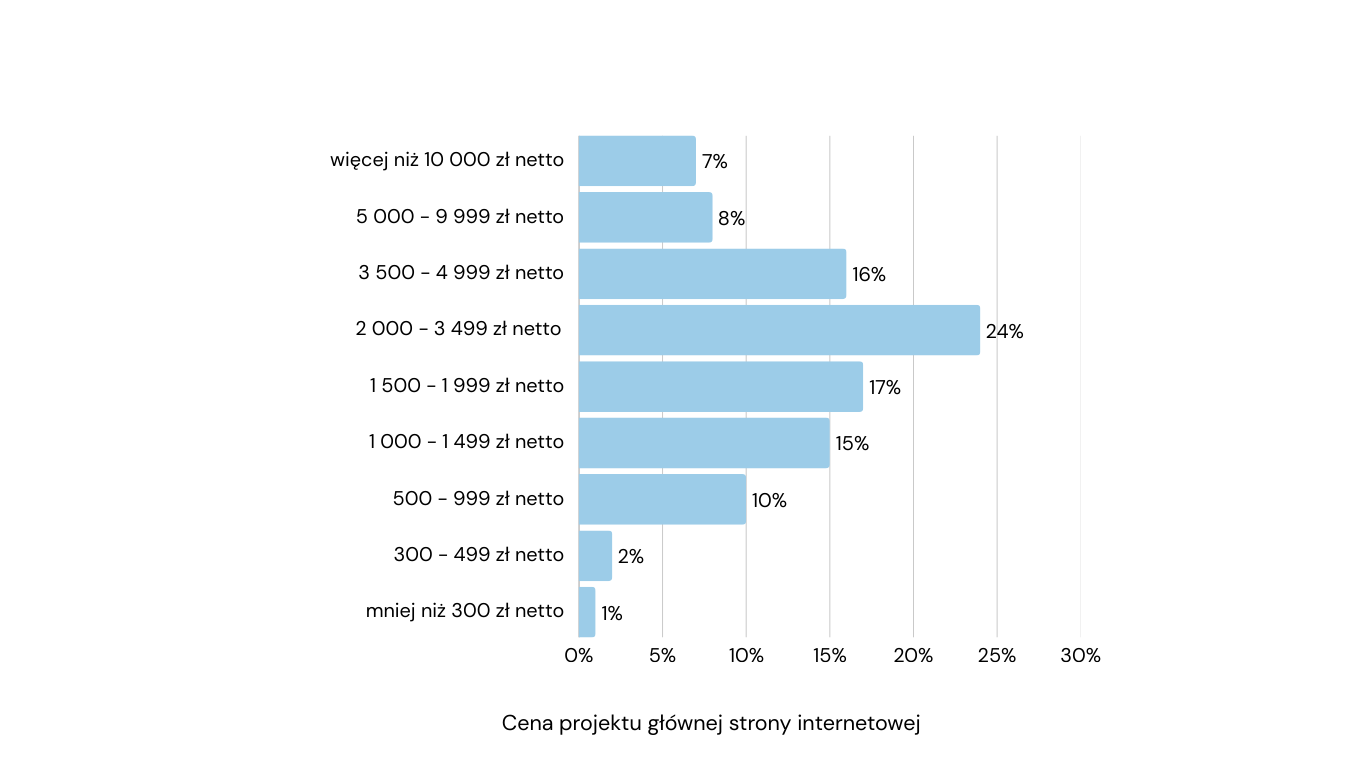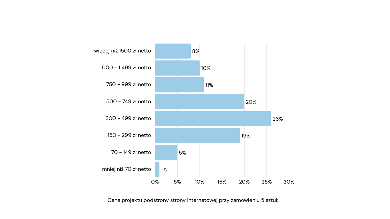 Najczęściej spotykanym przedziałem cenowym jest 300–499 zł netto za podstronę – wskazało tak 26% ankietowanych.