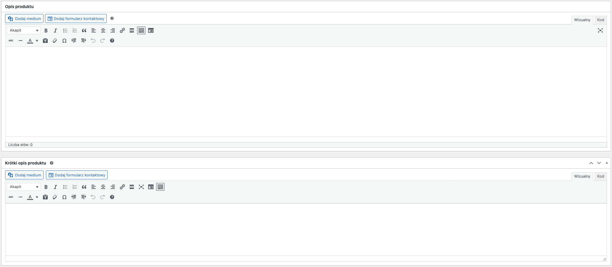Dodaj opis produktu w polu głównym oraz krótki opis, który wyświetli się na stronie głównej lub w podglądzie produktu.